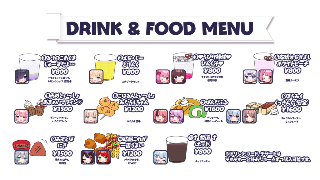 ・ご注文は1会計につき「ドリンク(①②③④⑪)」「デザート(⑤⑥⑦⑧)」「フード(⑨⑩)」から1点までとさせていただきます。
