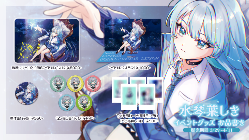 『チャンネル登録者1,000人達成記念「水琴葉しき」オンラインソロライブ』開催記念グッズ販売決定!